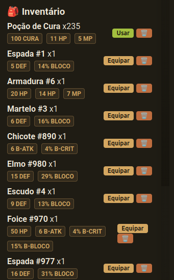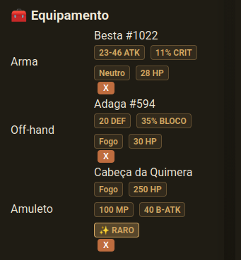 * **Amuleto:** Pode aumentar seu **HP**, **MP**, **ATK** e/ou **CRIT**.